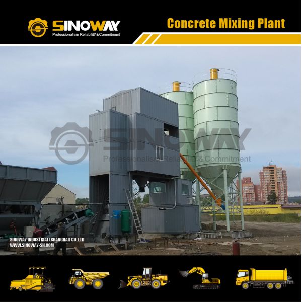 SINOWAY concrete mixing plant is a combinational device used to mix concrete in centralized.Because of its mechanization, high degree of automation, so the productivity is also high, and to ensure the quality of concrete and save cement.There are many different types and components of the concrete mixing plants, the basic structure includes: Feeding system, measuring (weighing) system, mixing system, electrical system and auxiliary equipments (such as air compressor, water pump etc. ). They are used to transport, feed, store, batch, weigh, mix and discharge the concrete raw materials: Cement, water, sand, crushed stone, admixture and additive.
